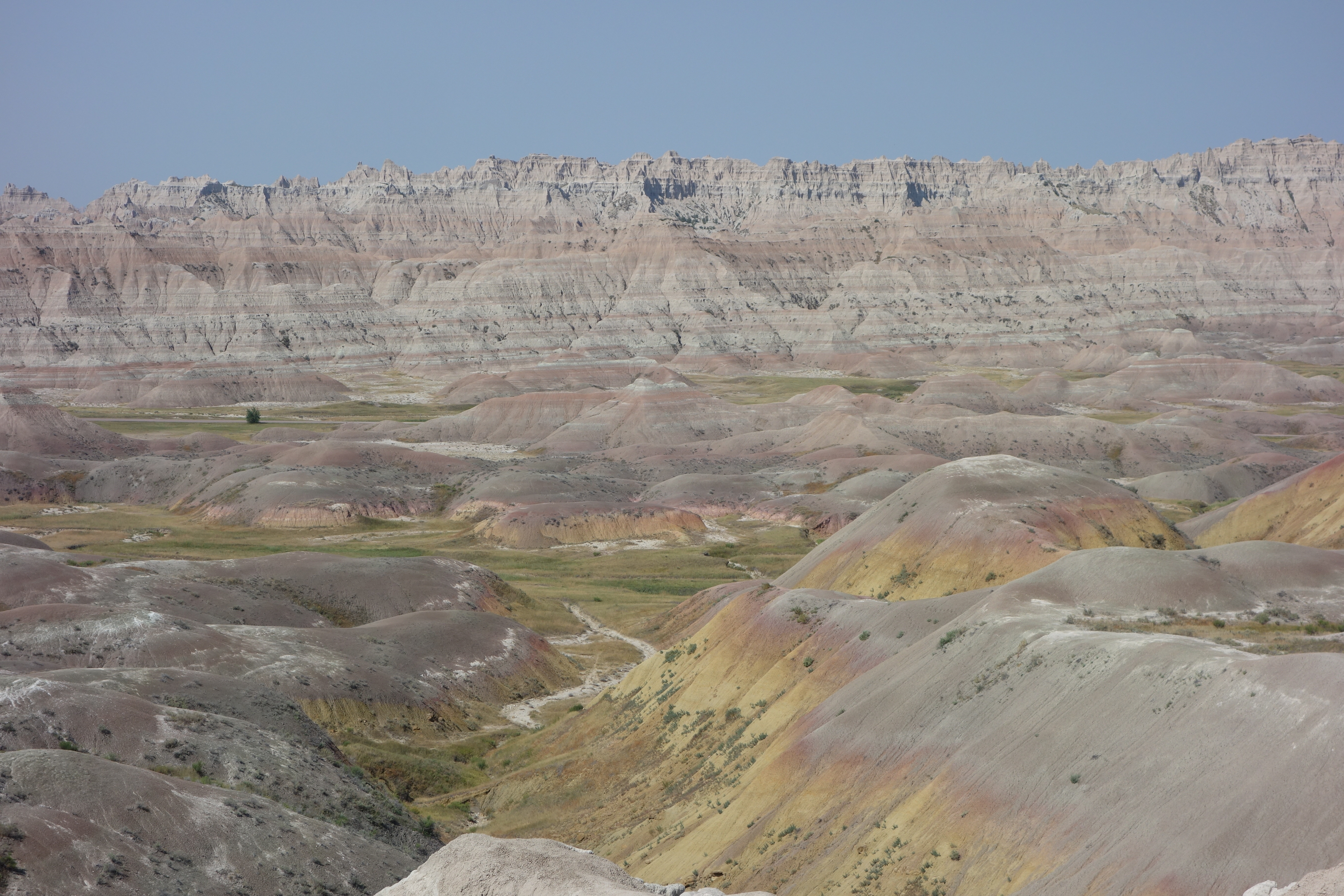 Badlands var en fin opplevelse i godt og varmt vær, her tok vi kjøkkeninngangen vestover og kjørte en del miles på grusvei før vi koblet oss sammen med resten av de besøkende på US240 på asfaltert vei igjen.